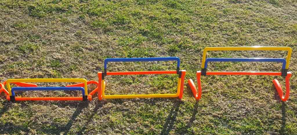 Mini hurdling involves running fast over low objects. I use 30cm high “mini hurdles”, sometimes known as “wickets”, for this activity.