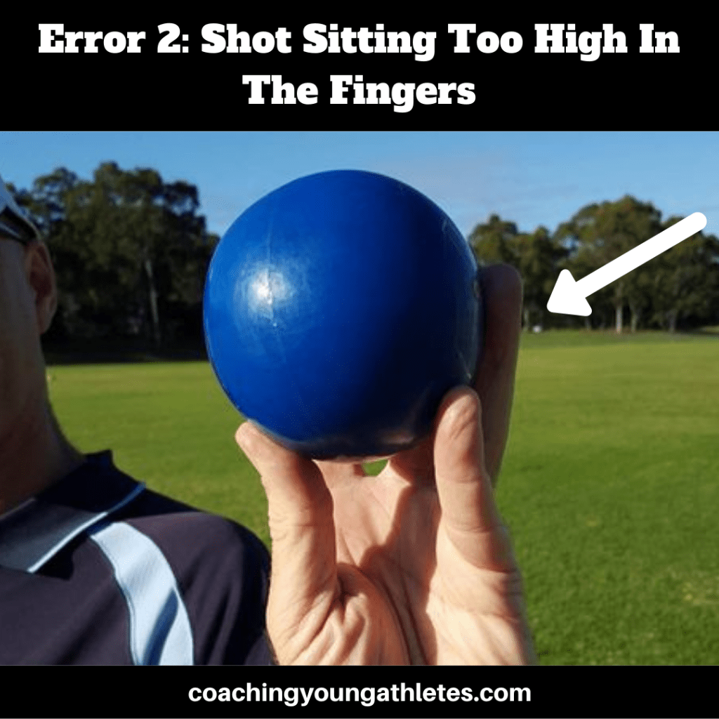 Here the young athlete tucks two of their fingers under the shot, usually leaving the implement gripped by just the thumb, index, and middle finger. This will lead to a lack of control of the shot and an impaired ability to launch the shot off the fingers