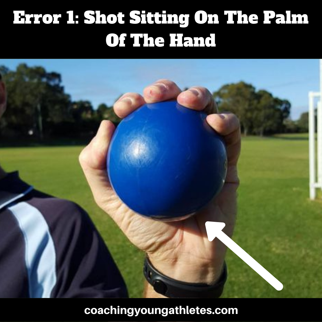 Here the young athlete tucks two of their fingers under the shot, usually leaving the implement gripped by just the thumb, index, and middle finger. This will lead to a lack of control of the shot and an impaired ability to launch the shot off the fingers
